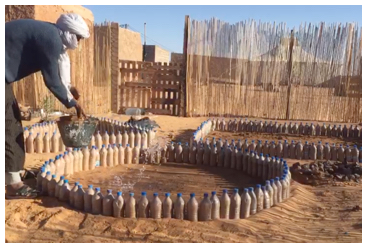 Todavía no hace mucho calor, pero en verano, con temperaturas superiores a los 50 grados centígrados, sería imposible estar al aire libre. En el suelo hay centenares de botellas de plástico de litro y medio, rellenas de arena, que sirven de ladrillos. Tateh ha encontrado en el desierto argelino que acoge a los refugiados saharauis un sistema para luchar contra las inclemencias del propio desierto.
