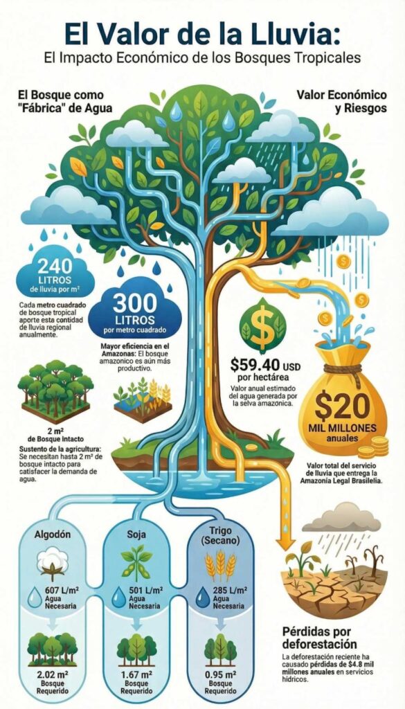 El estudio aterriza el argumento comparando las necesidades hídricas de cultivos concretos con la capacidad del bosque para generar humedad. El algodón, por ejemplo, requiere unos 607 litros de agua por metro cuadrado durante su crecimiento. Esa cantidad equivale, aproximadamente, a la lluvia generada por dos metros cuadrados de selva intacta.